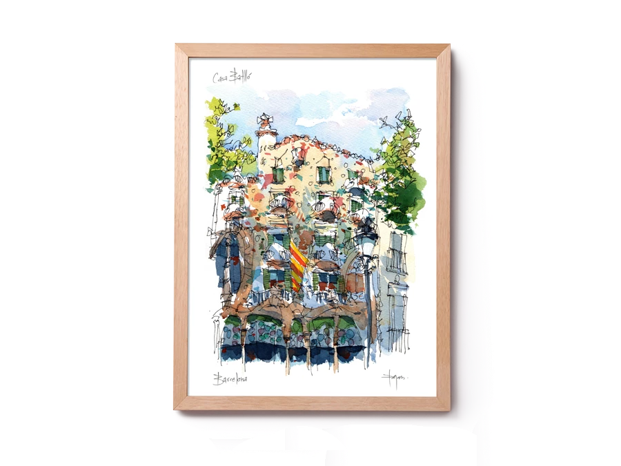 Casa Batlló is a building designed by the architect Antoni Gaudí, the highest representative of Catalan modernism. It is a comprehensive remodeling of a previously existing building on the site, the work of Emilio Sala Cortés. HIGH-QUALITY WATER COLOR PRINT Signed by the artist Daniel Pagans, it’s a Catalan artist who design this beautiful watercolor print. Watercolor paper (200g / m2) Sizes: A4 (21 x 29.7cm) (unframed)