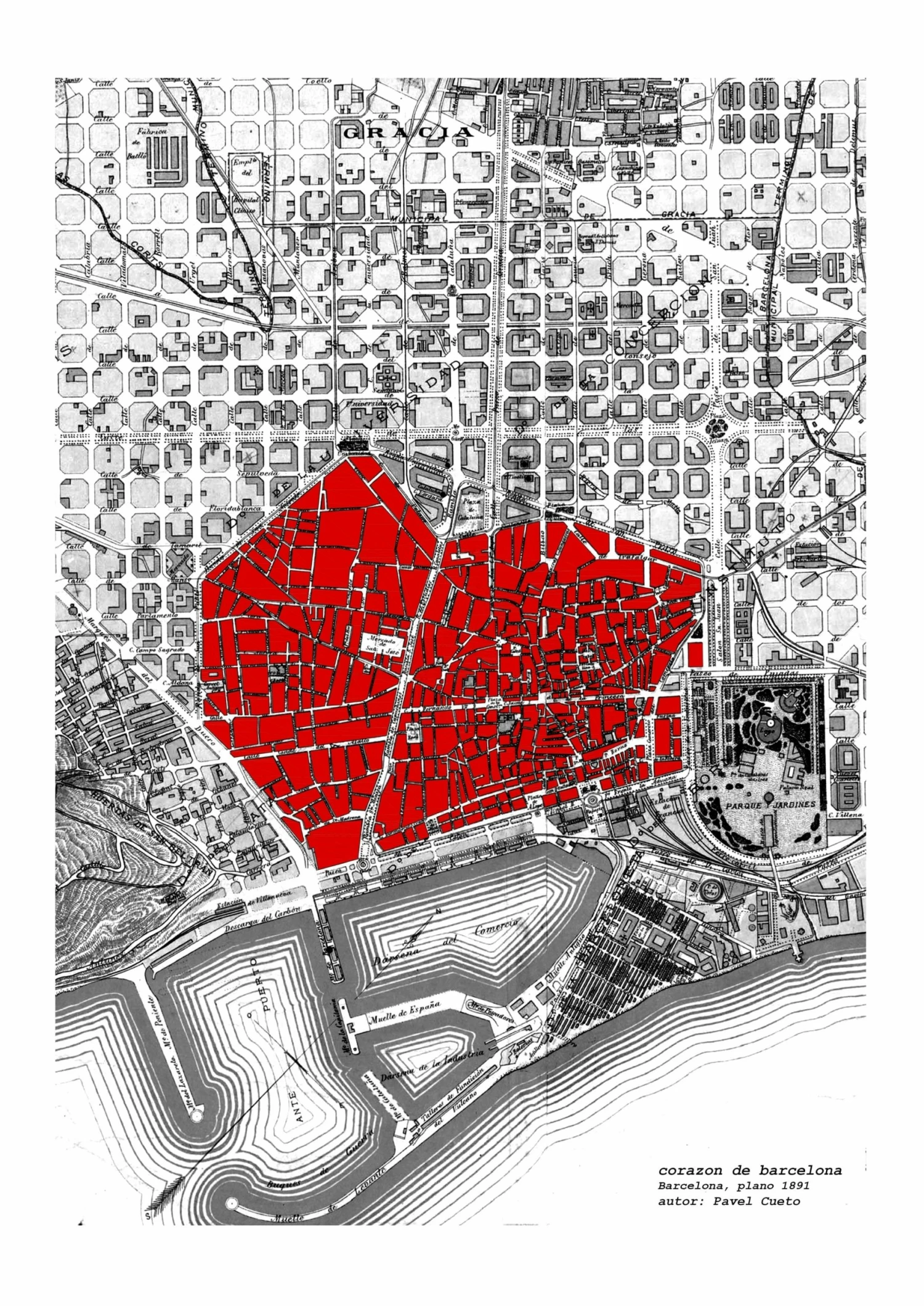 The true heart of Barcelona drawn on the city map. The symbolic form is made from the borders of the Old City.