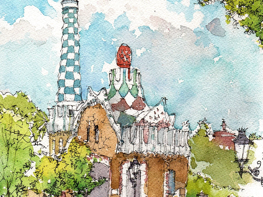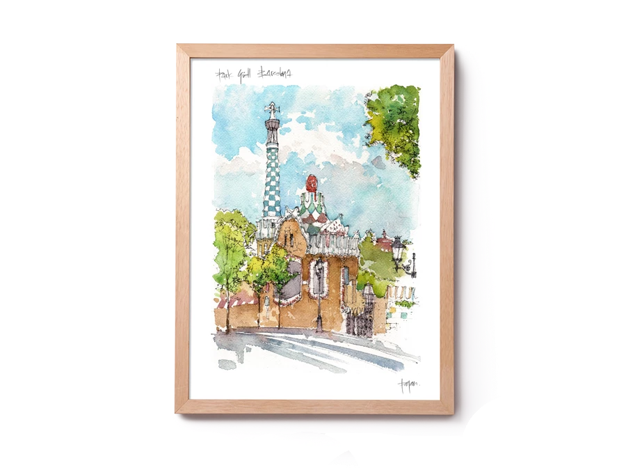 Güell Park is a public park with gardens and architectural elements located in the upper part of the city of Barcelona, in the foothills of the Collserola mountain range. The park is located on the southern slope of Mount Carmel and adjacent to the northern slope where the Carmel park is located. HIGH-QUALITY WATER COLOR PRINT Signed by the artist Daniel Pagans, it’s a Catalan artist who design this beautiful watercolor print. Watercolor paper (200g / m2) Sizes: A4 (21 x 29.7cm) (unframed)