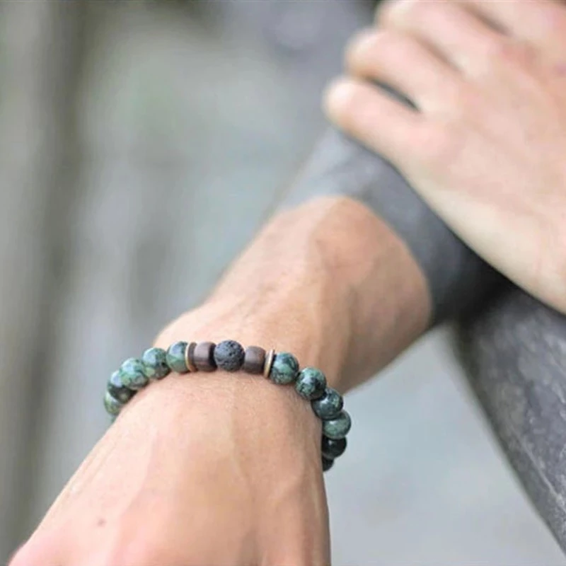 Pulsera elástica, con cuentas africanas naturales, en tonos negros, grises y ojo de tigre, cuentas de 8mm, y detalle de calavera en color plateado aprox, de 8-9mm.
