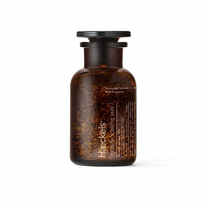 Mineral rich Sea bath salts packed with raw local botanicals, create a 100% natural soothing experience for mind and body 250ml. Haeckels Stress Fix Soaking Salts are made up of Dead Sea salt combined with rosemary and clary sage oils as well as raw local botanicals to bring a perfect balance to the mind and body. Vitamin-rich seaweed, sea buckthorn and arnica oil soothes, refreshes and hydrates dry, stressed skin. Alternatively combine with our seaweed bath for a more potent and relaxing, aromatic bathing experience. How To Use: Dissolve a few shakes into a warm bath and allow to settle, then enjoy your bath. Enjoy with our Regenerating Bath Oil. Dead Sea Salt, Salvia Sclarea (Sage), Lavandula Angustifolia (Lavender), Rosmarinus Officinalis (Rosemary), Fucus Vesiculosis (Seaweed) Dried Extract, Hippophae rhamnoides (Sea Buckthorn) Oil, Arnica Cordifolia (Arnica) Oil. Water Free, Alcohol Free, Oil Free, Silicone Free, Nut Free, Vegan, Gluten Free, Soy Free, Cruelty Free.