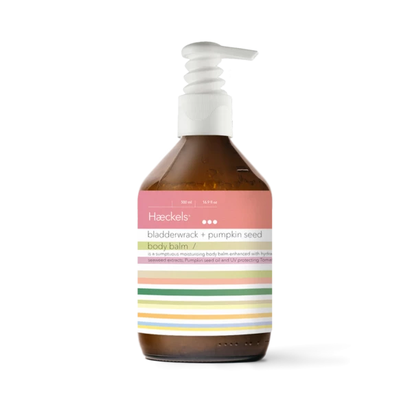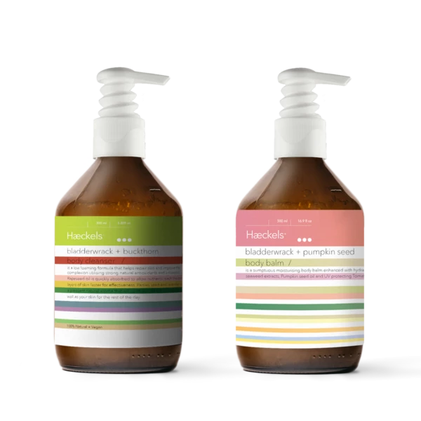 Restorative, earth-kind, skin-kind; this body wash and body balm set from cult brand Haeckels makes for a indulgent gift or a little treat for yourself. Bladderwrack & Pumpkin Body Balm: A sumptuous moisturising body balm that is 100% natural with a refreshing scent, perfect for use on hands and body after cleansing to provide nourishment using natural botanicals. Enhanced with hydrating Seaweed extracts, Pumpkin Seed Oil and UV protecting Tomato Seed Oil. Particularly suited to parched skin. Size: 500ml, glass bottle with recyclable pump. This is a low foaming formulation containing extract of indigenous plants and locally harvested Seaweed extract. It comes in a glass bottle with a fully recyclable pump dispenser. Bladderwrack & Buckthorn Body Cleanser: Sea Buckthorn, Seaweed and Tea Tree in the body cleanser help to repair skin and improve the complexion with strong antioxidants, vitamins and antiseptic qualities which will help to purify the skin. Rapeseed oil is quickly absorbed to make nutrients reach the lower layers of skin faster for effectiveness. Parsley Seed and Lavender crease a pleasant aroma that uplifts and refreshes your senses as well as your skin for the rest of the day. Size: 300ml, glass bottle with recyclable pump. Body Balm Ingredients: Seaweed (broth), Fucus Vesiculosus (Bladderwrack) Extract, Caprylic/capric triglyceride (light coconut) oil, Vitis vinifera (Grapeseed) seed oil, Solanum Lycopersicum (Tomato seed) oil, Eco Marine Extract, Hippophae Rhamoides (Sea Buckthorn) Fruit Oil, Cedrus Atlantica (Cedar wood) Bark oil, Daucus Carlota Sativa (Carrot) Seed oil, Punica Granatum (Pomegranate) Seed oil, Citrus Medica Limonum (Lemon) oil, Glyceryl stearate, Peg 100 stearate, Glycerin (Veg), Glyceryl stearate S/E, Stearic acid, Tocopheryl acetate (Vitamin E.) Body Wash Ingredients: Seaweed (broth), Fucus Vesiculosus (Bladderwrack) Extract, Aloe Bardadensis Leaf Juice, Ammonium Laurly Sulfate, Citric Acid, Polyglyceryl-4-Caprate, Cocamidopropyl Betaine, Glycerly Oleate, Coco-Glucoside, Sodium Benzoate, Sodium Chloride, Salvia Scalrea (Clary Sage oil), Lavandula Angustifolia (Lavender) oil, Rosmarinus Officinalis oil, Glycerin, Potassium Sorbate, Linalool, Limonene, Geraniol, Tocopheryl acetate (Vitamin E), Daucus Carota Sativa (Carrot) Seed oil, Hippophae Rhamnoides (Sea Buckthorn), Triticum Vulgare (Wheat) Germ oil.
