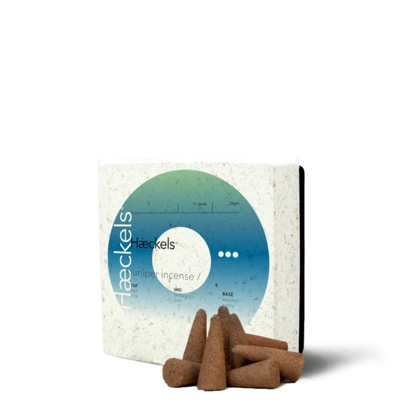 Haeckels Juniper Incense Cones Juniper grows in the form of around 52 different species which have each adapted to changing conditions around the world, Juniperus refers to Juniper as a whole which is then individually characterised regionally. The coastal form of Juniper in our cones grows as a low and dense bush with bluish berries and dark green needle-like leaves, it is a hardy perennial which has adapted to the shoreline environment to be substantial enough to cope with the salt water and strong winds. Juniper berries are used in a wide variety of culinary dishes and for a distinct flavouring in gin as well as the primary flavour in the liquor Jenever. Light cone and burn for around 15 seconds blowing the ember hot, place in the heart of your home either hallway or landing. Use the coin as a burning surface. Great for travel. 17 cones per tin, Burning time: 15 min approx. Scent longevity: 2-4 hours (medium size room) Vintage penny included to burn cone on. Packaging is decomposable