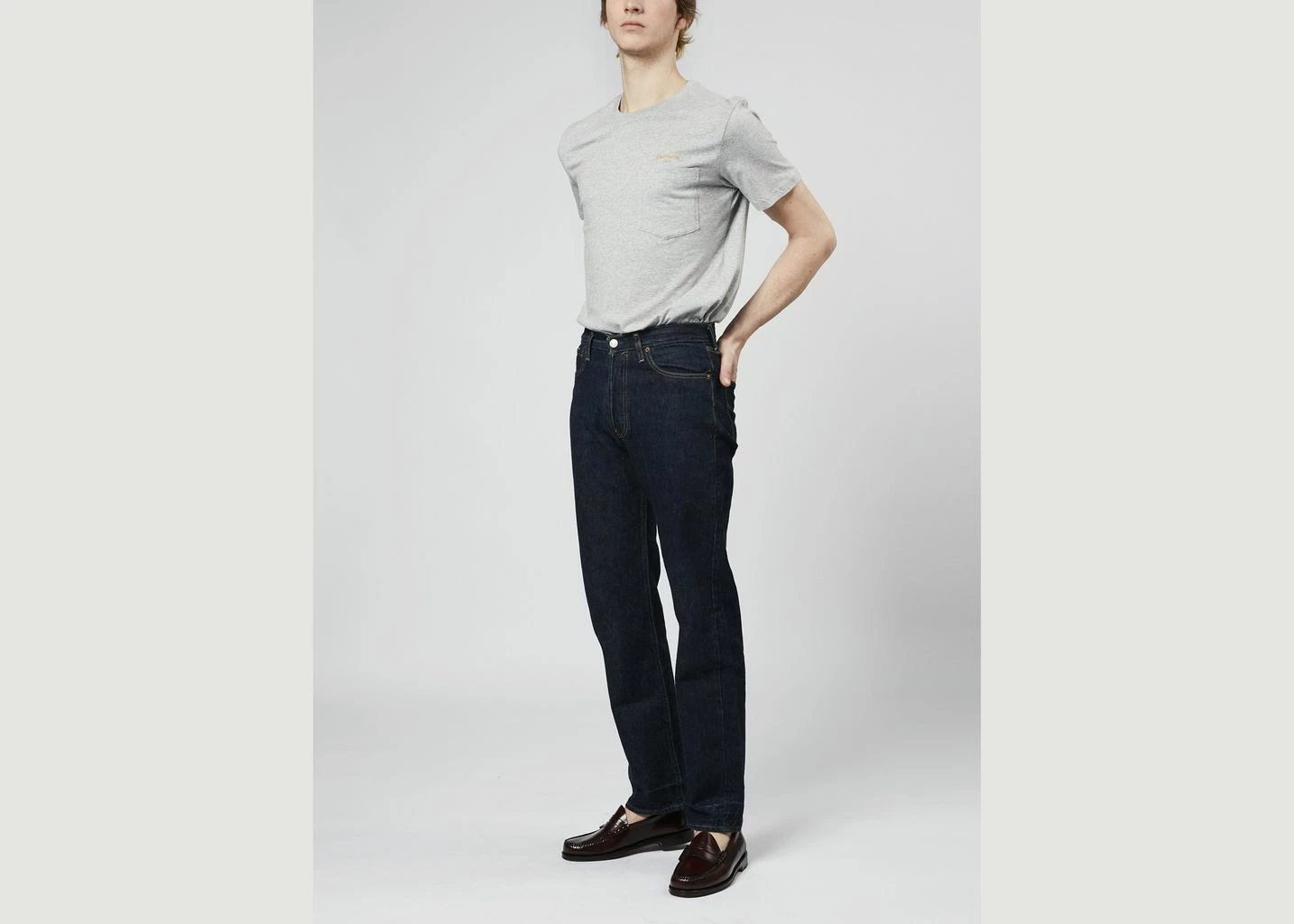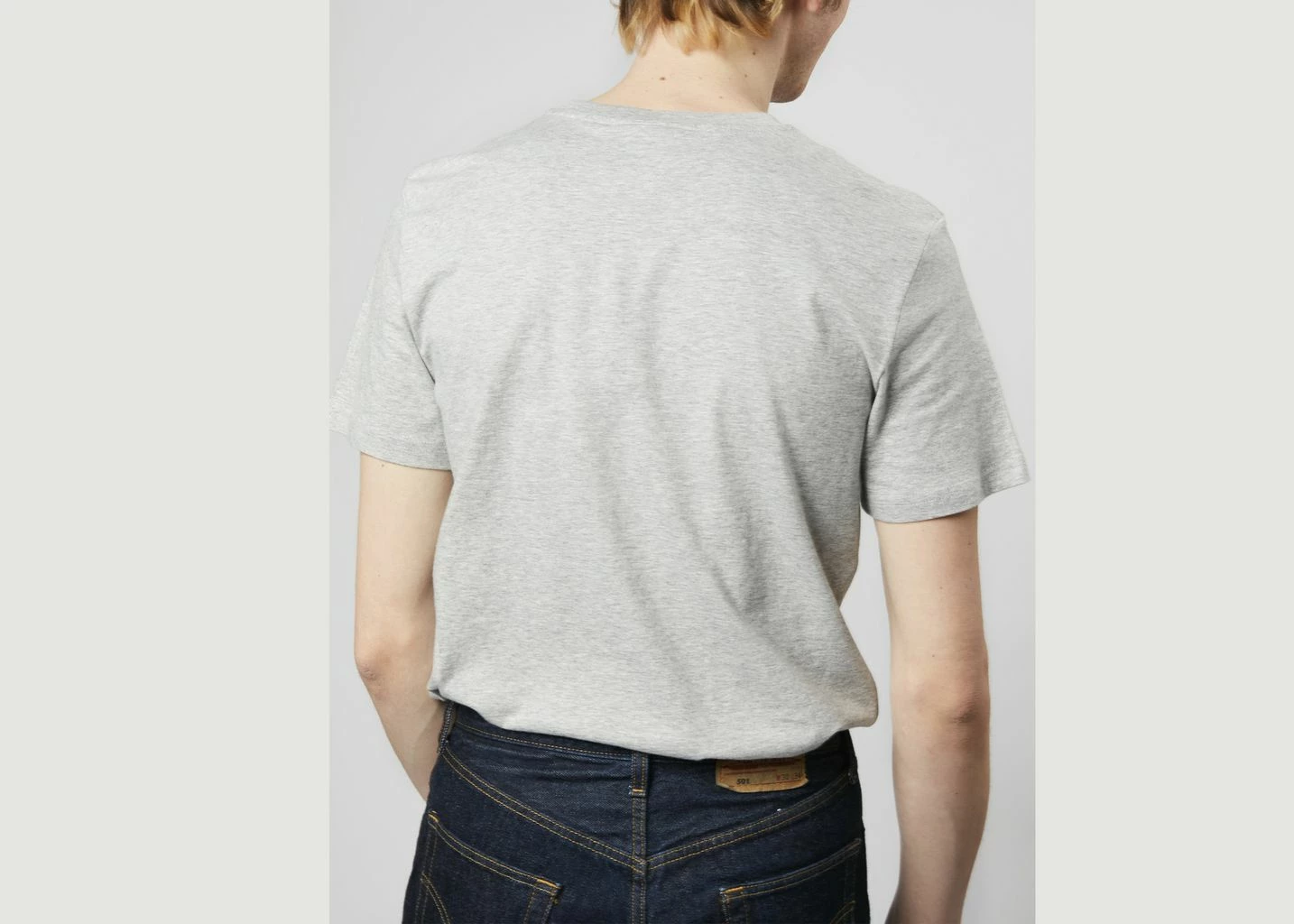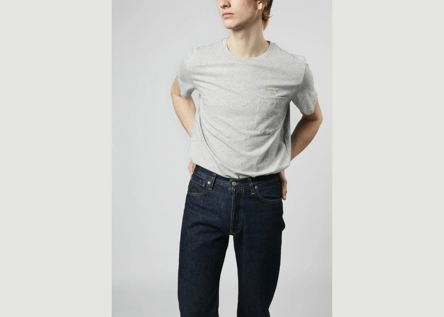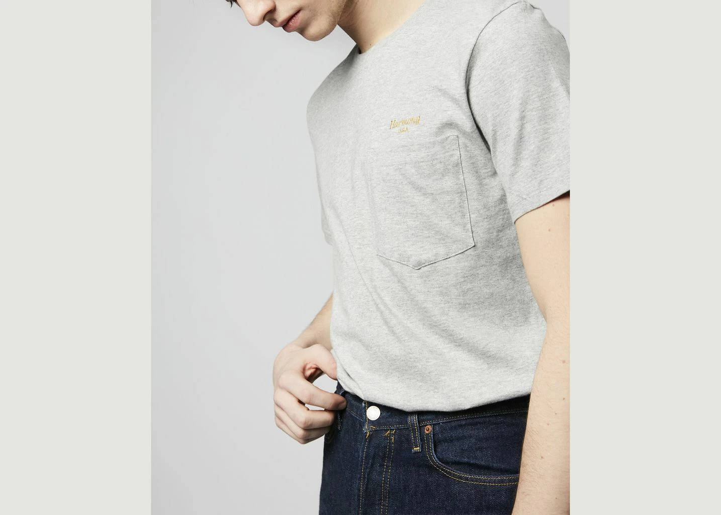 Ash grey cotton Teddy Cursive t-shirt, round and ribbed collar, short sleeves, straight cut, gold “Harmony USA” embroidery on the chest, one chest pocket, tone-on-tone stitching.