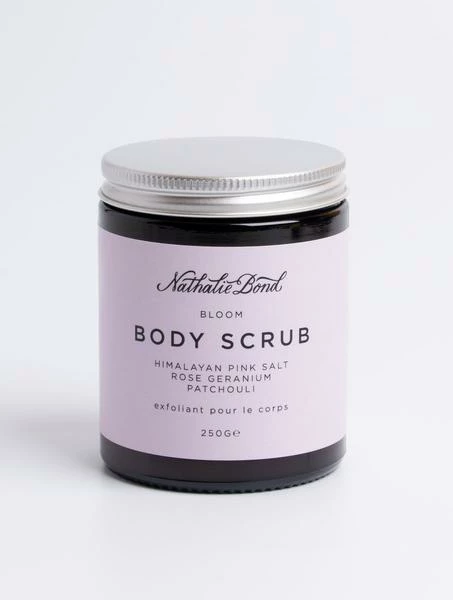 Bloom Body Scrub 100% natural ingredients Contains essential oils 250g Here we have the Bloom Body Scrub from Nathalie Bond. This body scrub is a gently exfoliating and highly nourishing blend of Himalayan Pink Salt, coconut oil and shea butter with the delicate floral scent of rose geranium. It leaves skin feeling soft, nourished and glowing. Suitable for all skin types, especially dry skin.