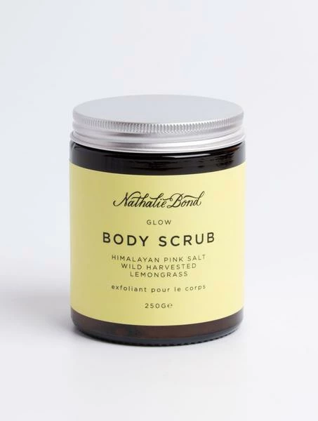 Glow Body Scrub 100% natural ingredients Contains essential oils 250g Here we have the Glow Body Scrub from Nathalie Bond. An invigorating body scrub to help smooth, soften and refresh, for skin that is nourished and hydrated. Himalayan pink salts gently sweep away dead skin cells, lemongrass invigorates, while coconut oil and shea butter nourish and hydrate. Suitable for all skin types, especially dry skin.